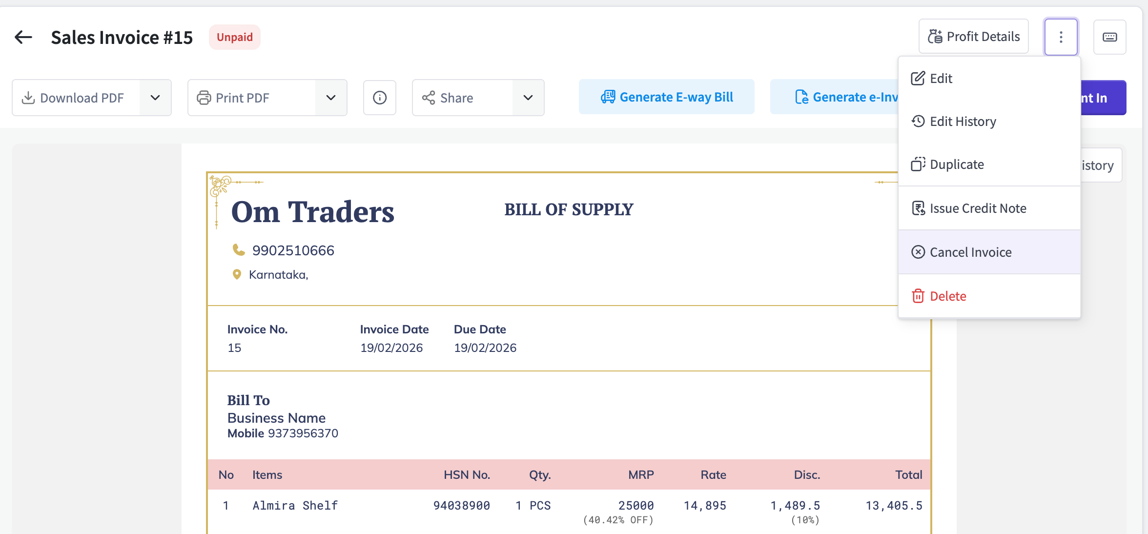 4. CA-Ready Records CAs demand complete records. Cancelled invoices generate a PDF with a visible "Cancelled" watermark that can be downloaded, printed, and shared.